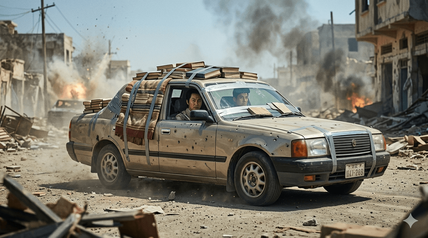 1991년 소말리아 내전 실화를 바탕으로 한 영화 <모가디슈>. AI가 생성한 이 이미지 속에는 류승완 감독이 구현한 압도적인 리얼리티와 90년대 모가디슈 시내의 황량함, 그리고 빗발치는 총알 속을 뚫고 나가는 전율의 카체이싱 액션이 모두 담겨 있습니다.